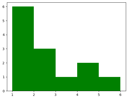 plt.hist(frequencies, [1, 2, 3, 4, 5, 6], color = 'g')